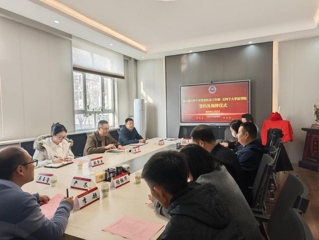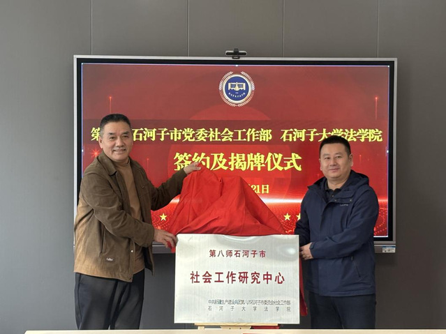 为深入贯彻落实中央社会工作部办公厅、教育部办公厅联合印发《关于加强社会工作专业实习实践基地建设的通知》要求,进一步深化社会工作专业校地理论与实务合作,推动专业教育与社会实践深度融合,2025年11月21日,第八师石河子市党委社会工作部与法学院合作共建、教学实习基地签约暨“第八师石河子市社会工作研究中心”揭牌仪式在法学院隆重举行。法学院党委副书记、院长张瑜,法学院副院长田振江及相关科室负责人、教师代表,第八师石河子市党委社会工作部部长李平、副部长常顺及部门相关工作人员出席仪式。